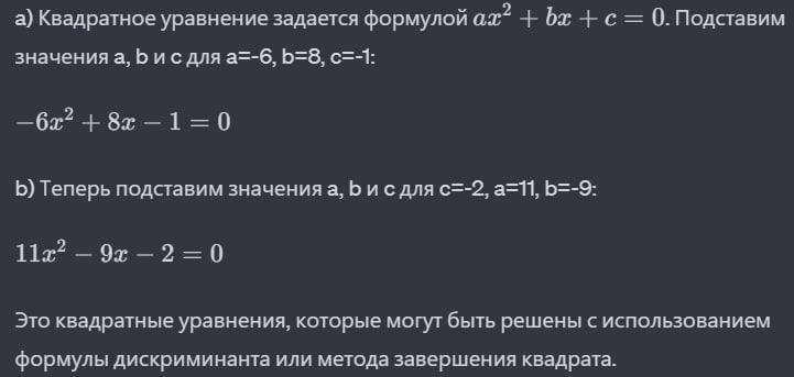 +bx+c=0. Подставим значения a, b и c для a=-6, b=8, c=-1: