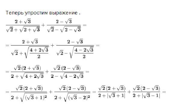 ((2+sqrt(3))/(sqrt(2)+sqrt(2+sqrt(3)))+(2-sqrt(3))/(sqrt(2)-sqrt(2-sqrt(3))))