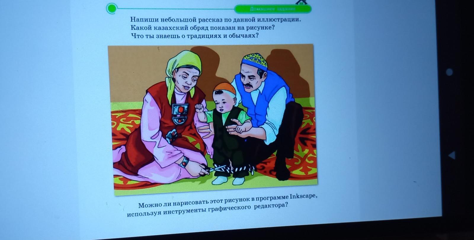 Напиши небольшой рассказ по данной иллюстрации. Какой казахский обряд показан на рисунке? Что ты знаешь о традициях и обычаях? Можно ли нарисовать этот рисунок в программе Inkscape, используя инструменты графического редактора?