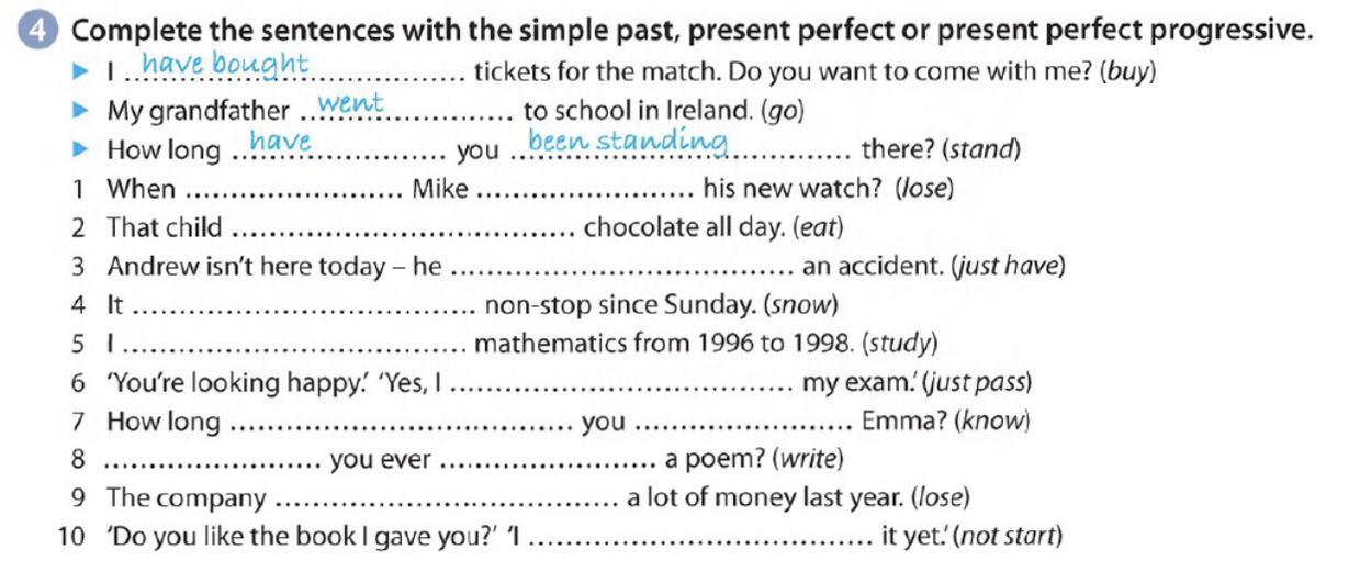Complete the sentences with the simple past, present perfect or present perfect progressive