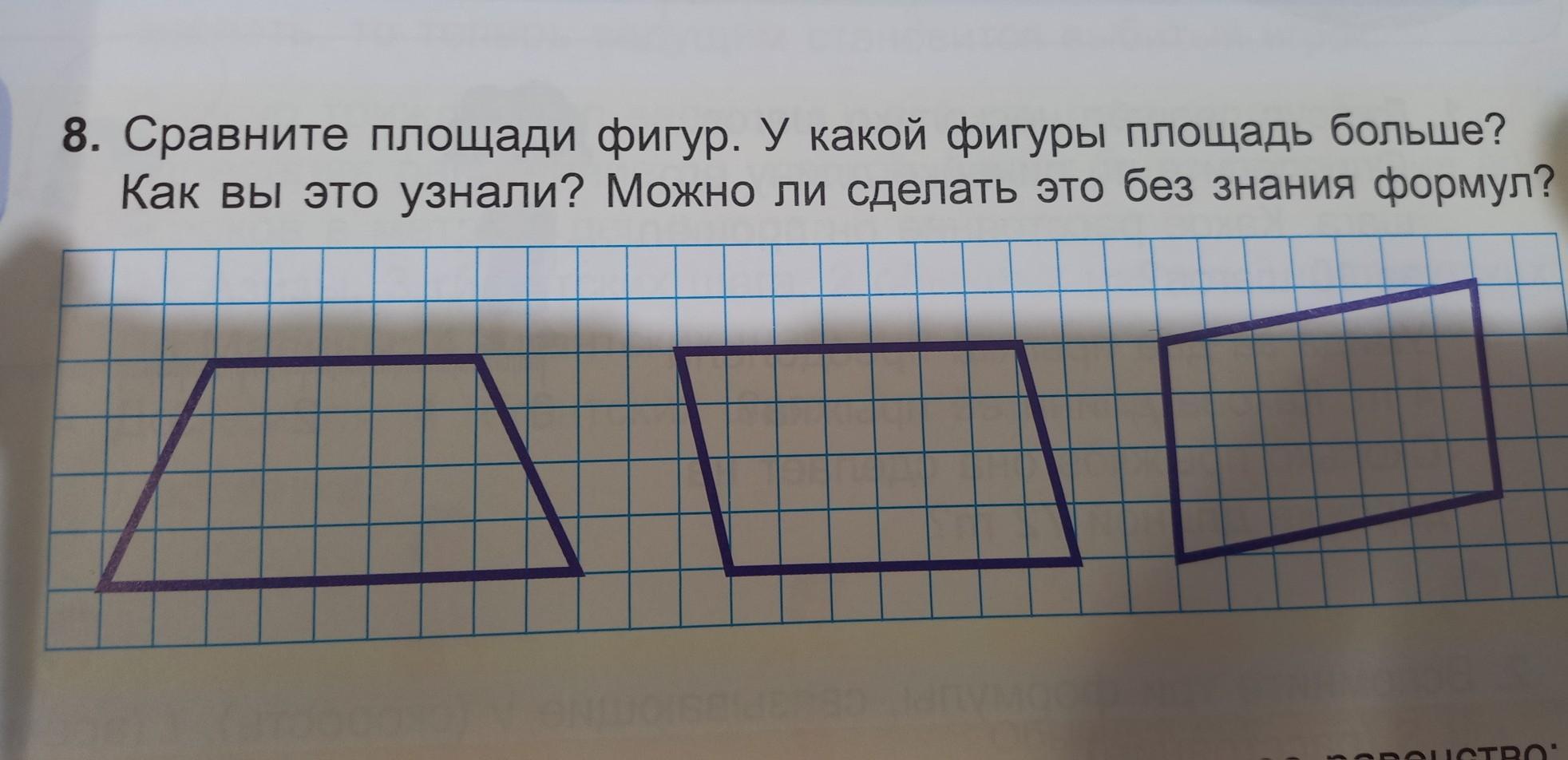 сравните площади фигур. У какой фигуры площадь больше? как вы это узнали? Можно ли сделать это без знания формул?