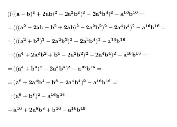 спростіть вираз ((((a-b)²+2ab)²-2a²b²)²-2a⁴b⁴)²-a¹⁶-b¹⁶