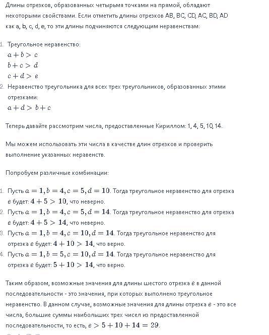 На прямой отмечены точки А, B, C и D. Получилось шесть отрезков: AB, BC, CD, AC, BD, AD. A B C D Кирилл измерил длины пяти из этих отрезков и выписал получившиеся числа в порядке возрастания: 1, 4, 5, 10, 14.