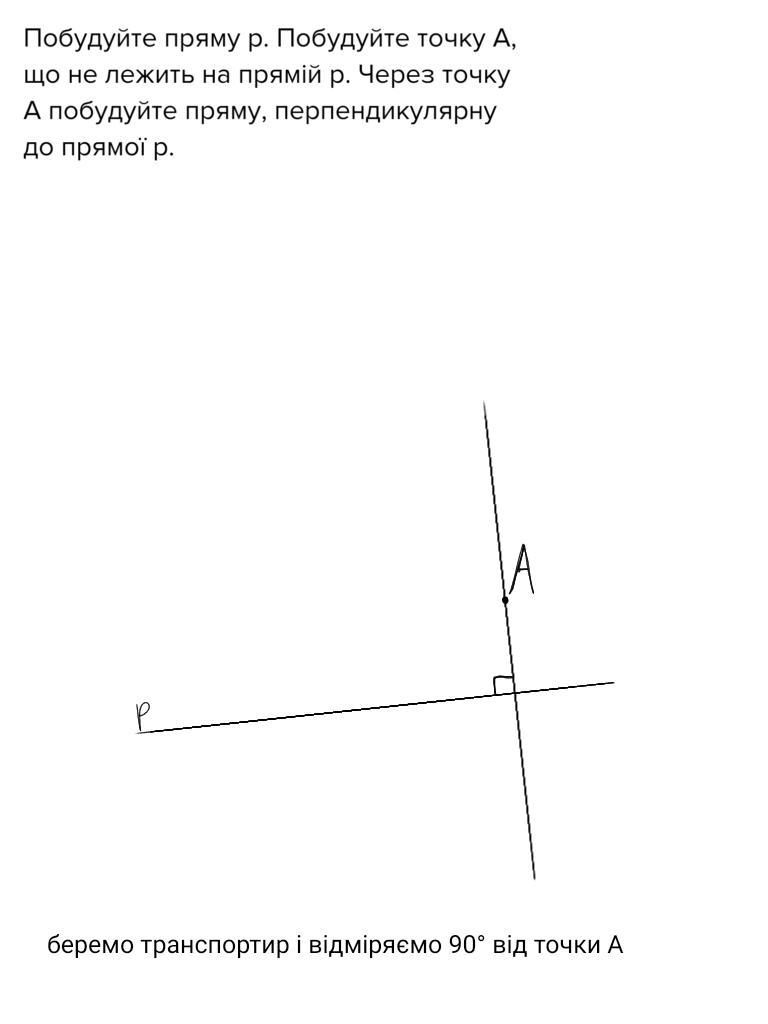 Побудуйте пряму р. Побудуйте точку А, що не лежить на прямій р. Через точку А побудуйте пряму, перпендикулярну до прямої р.