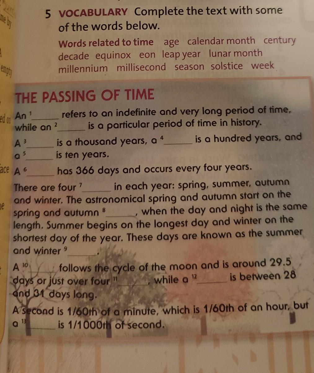 THE PASSING OF TIME An ¹ while an 2 A³ S 5 VOCABULARY Complete the text with some of the words below. Words related to time age calendar month century decade equinox eon leap year lunar month millennium millisecond season solstice week is a thousand years, a _________ is a hundred years, and is ten years. A has 366 days and occurs every four years. There are four 7 in each year: spring, summer, autumn and winter. The astronomical spring and autumn start on the spring and autumn 8 when the day and night is the same length. Summer begins on the longest day and winter on the shortest day of the year. These days are known as the summer and winter A 2 10 Y refers to an indefinite and very long period of time, is a particular period of time in history. follows the cycle of the moon and is around 29.5 days or just over four while a 12 is between 28 and 31 days long. A second is 1/60th of a minute, which is 1/60th of an hour, but is 1/1000th of second. 13 7