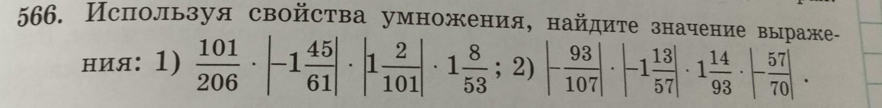 566. Используя свойства умножения, найдите значение выраже- 93 1) 57 107 ния: 101 206 н 45 61 2 101 1 8 53