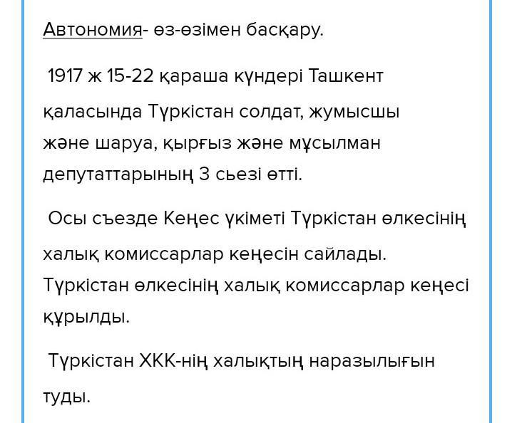 ? 1. Автономиялы республиканы құру үшін қандай факторлар қажет? 2. Казак АКСР-інің Алашорда үкіметі мен Түркістан автономиясынан айырмашылығы қандай? 3. Неге большевиктер қазақ халқына автономия берді деп ойлайсың? 4. Неліктен қазақтың жер аумағы мәселесінің шешілуі ұлт зиялылары үшін аса маңызды болды? 5. «Қазақ АКСР-інің алғашқы астанасы ретінде Орынбор қа- ласының таңдалуы большевиктер үшін тиімді еді» деген пікірмен келісесің бе?