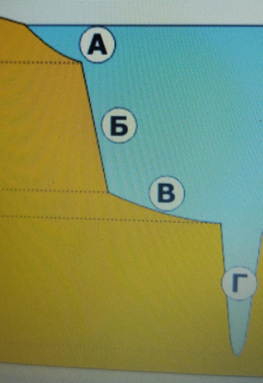 ? Запитання №11 (на встановлення відповідності) Встановіть відповідність між елементами океанічного дна, які позначенi на рисунку буквами та їх назвами. 200 м 3000 м 6000 м 11022 M A Б В Г