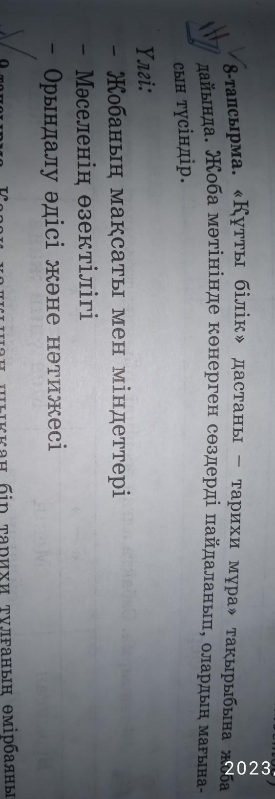 8-тапсырма. Құтты білік» дастаны тарихи мура» тақырыбына жоба дайында. Жоба мәтінінде көнерген создерді пайдаланып, олардын магына - сын түсіндір. Үлгі: Жобаның мақсаты мен мiндеттерi Мәселенің өзектілігі Орындалу әдісі және нәтижесі