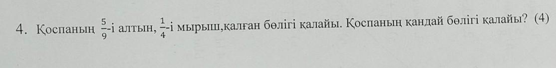 Қоспаның 9 ден 5 бөлігі алтын, төрттен бір бөлігі мырыш,қалған бөлігі қалайы.Қоспаның қандай бөлігі қалайы?