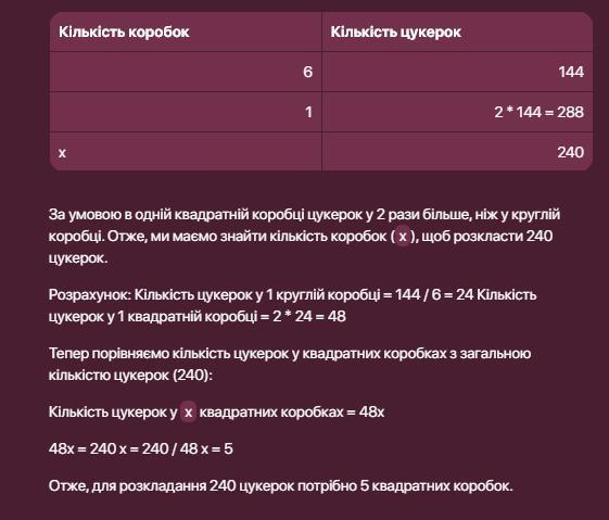 У 6 круглих коробок розклали 144 цукерки. А в одній квадратній коробці цукерок у 2 рази більше. Скільки потрібно коробок, щоб розкласти 240 цукерок? (Умова таблицею)