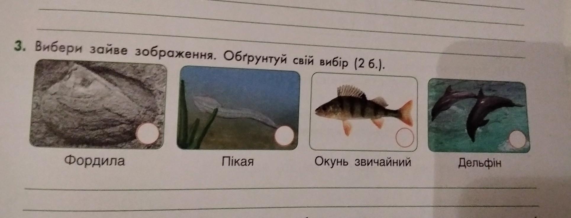 3. Вибери зайве зображення. Обґрунтуй свій вибір (2 б.). Фордила Пікая Окунь звичайний Дельфін