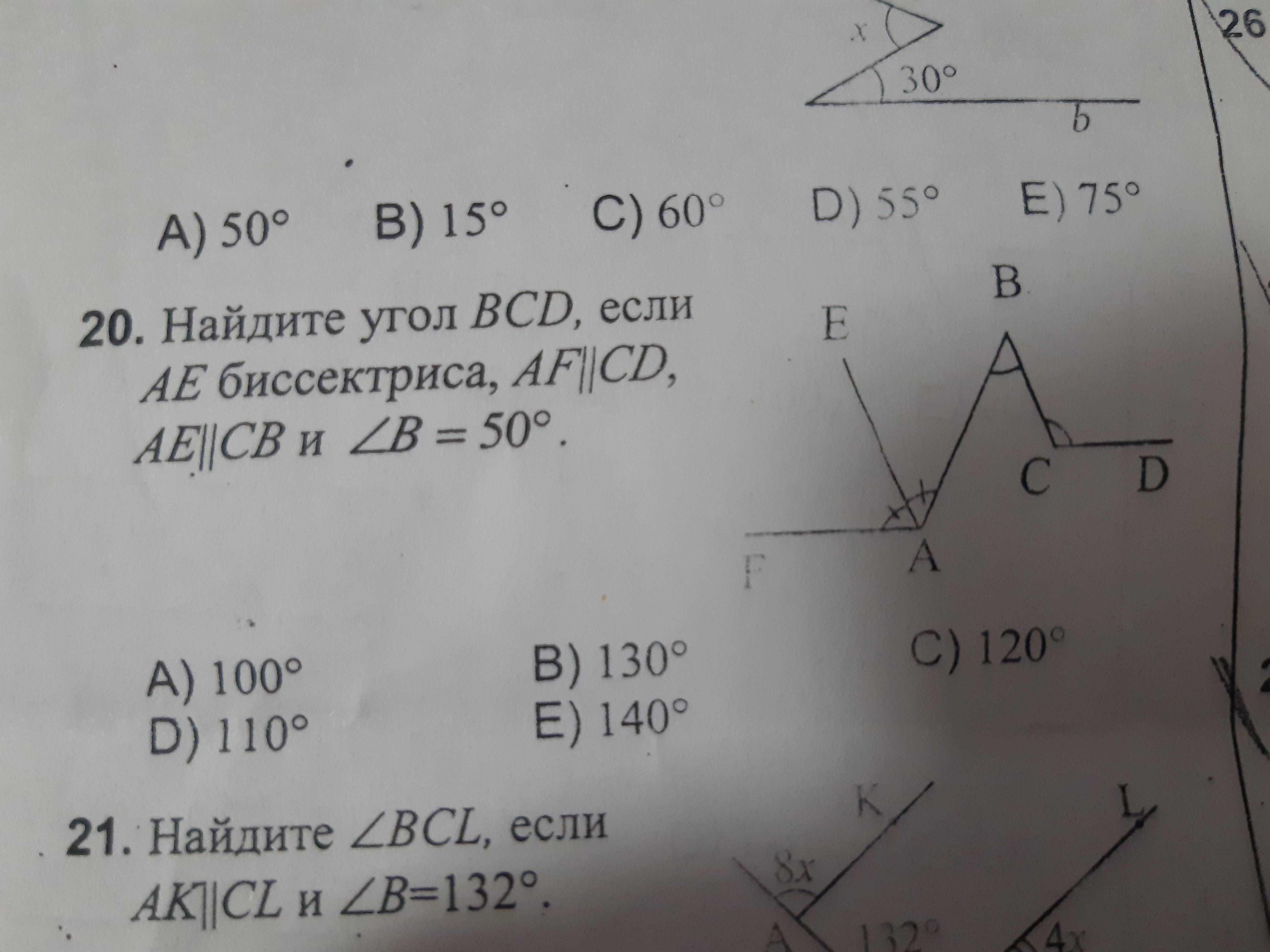 Найдите угол BCD, если АЕ биссектриса, AF||CD, AE||CB и B=50°