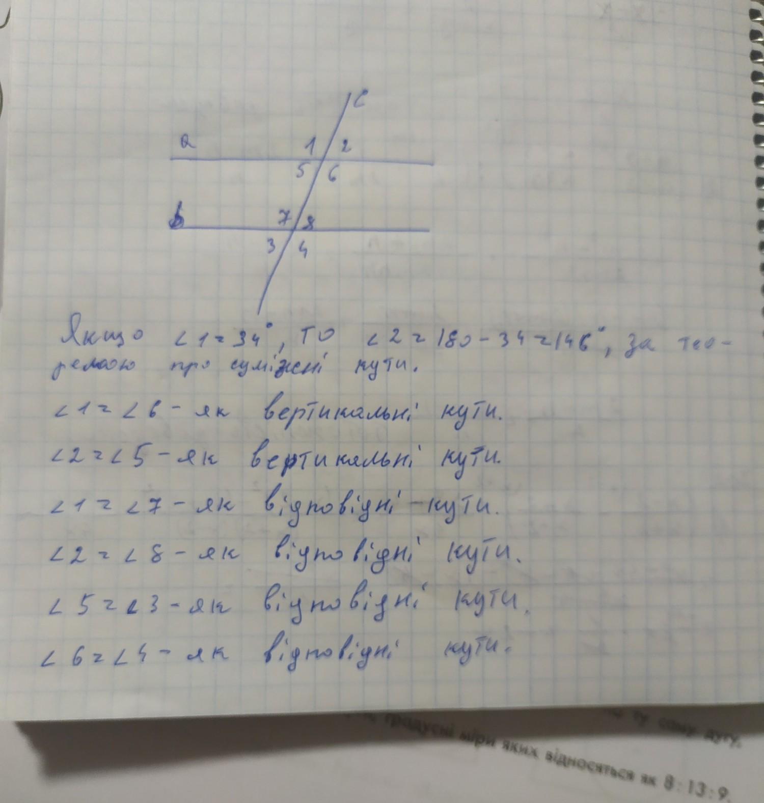 за малюнком,де а паралельна б і с-січна,знайти всі кути якщо знаємо один кут. кут 1=34 градуси