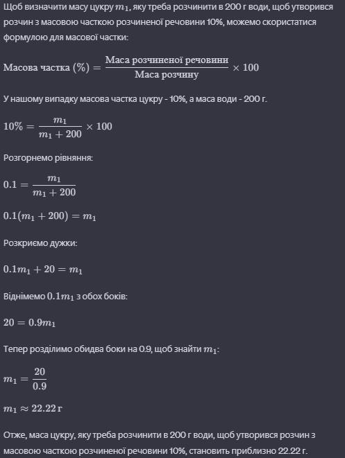 визначте масу цукру яку треба розчинити в 200 г води щоб утворився розчин з масовою часткою розчиненої речовини 10%