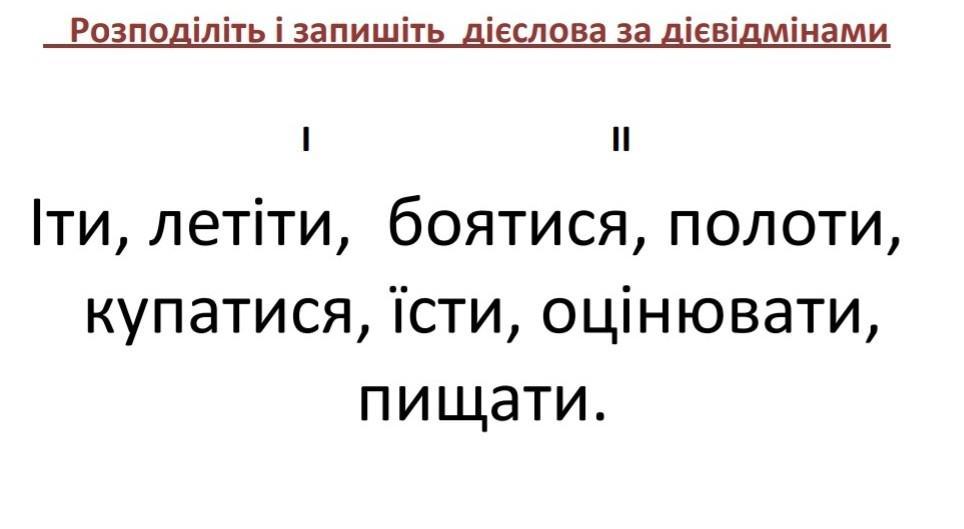 Pозподіліть і запишіть дієслова за дієвідмінами I II Іти, летіти, боятися, полоти, купатися, їсти, оцінювати, пищати.