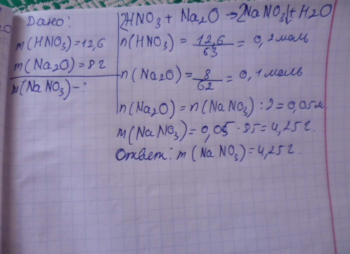 вычислите массу соли, образующейся при взаимодействии азотной кислоты массой 12,6 г с оксидом натрия массой 8г.