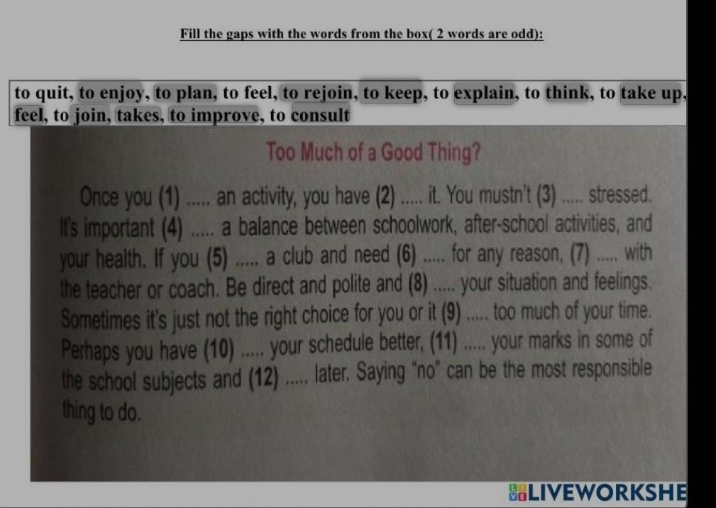 1 taken up 2 to keep, 3 feel, 4 to keep, 5 join, 6 to quit, 7 consult, 8 explain, 9 takes, 10 planned 11 improve, 12 rejoin