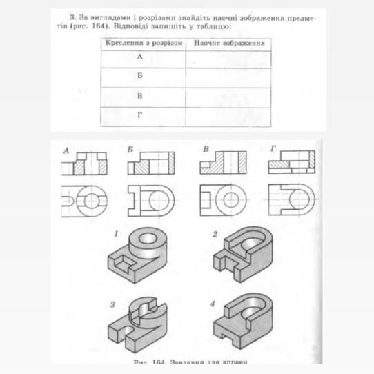 3. За виглядами і розрізами знайдіть наочні зображення предметів (рис. 164). Відповіді запишіть у таблицю: