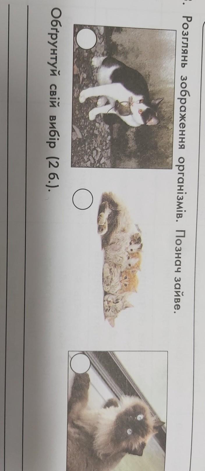 Відповідь: зайва картинка з котиком, який сидить зі щуром в роті, адже на всіх інших картинках зображені лише коти, а тут присутній генетично та біологічно інший організм