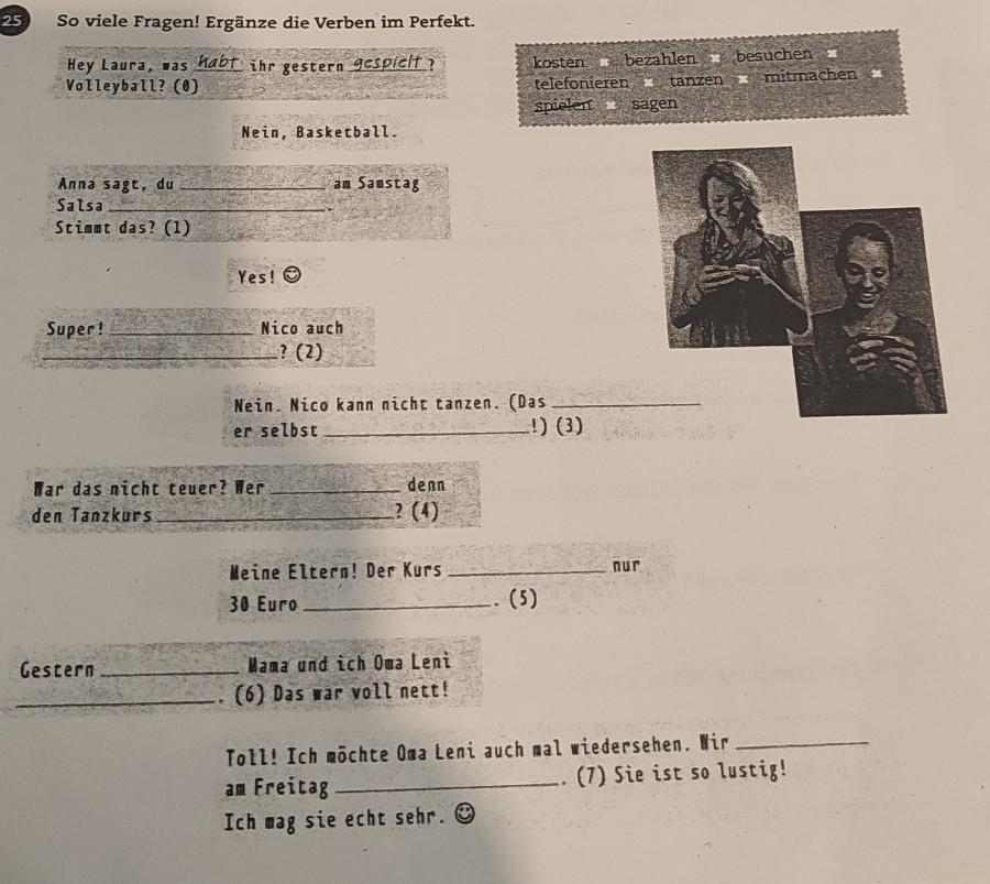 bat hat w twe pewa roge est . Wir wollen nicht danke" sagen! So viele Fragen! Ergänze die Verben im Perfekt. Hey Laura, was habt ihr gestern gespictt? Volleyball? (0) Anna sagt, du Salsa Stimmt das? (1) Super! War das nicht teuer? den Tanzkurs Gestern Nein, Basketball. Yes! am Samstag Nico auch ? (2) Nein. Nico kann niche canzen, (Das er selbst denn ? (4) Meine Eltern! Der Kurs 30 Euro Mama und ich Oma Leni (6) Das war voll nect! 1 kosten bezahlen telefonieren spielen Bagen !) (3) (5) besuchen tanzen * mitmachen - nur Toll! Ich möchte Oma mag sie echt sehr. (7)