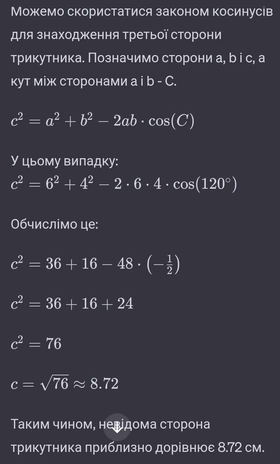 Таким чином, невідома сторона трикутника приблизно дорівнює 8.72 см.