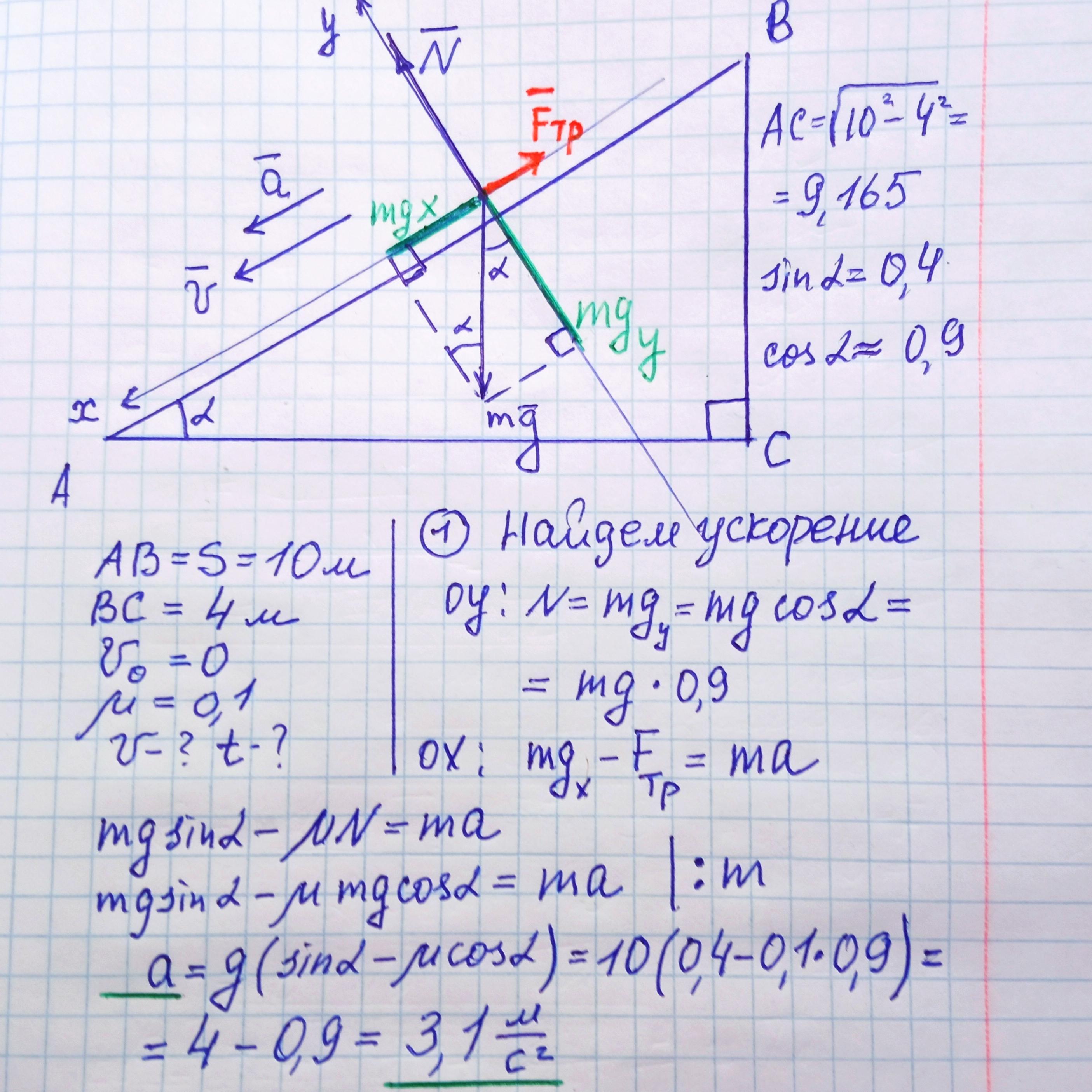 34. С вершины наклонной плоскости длиной 10 м и высотой 4 м начинает скользить тело. С какой скоростью и через какое время оно достигнет основания плоскости, если коэффициент трения составляет 0,1?