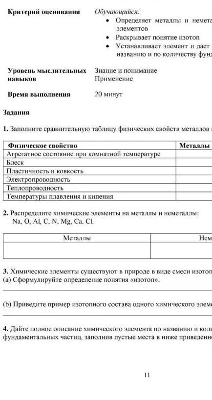 Заполните сравнительную таблицу физических свойств металлов и неметаллов. Физическое свойство Металлы Агрегатное состояние при комнатной температуре Блеск Тластичность и ковкость Электропроводность Сеплопроводность Семпературы плавления и кипения Распределите химические элементы на металлы и неметаллы: Na, O, Al, C, N, Mg, Ca, Cl. Металлы Неметаллы Неме