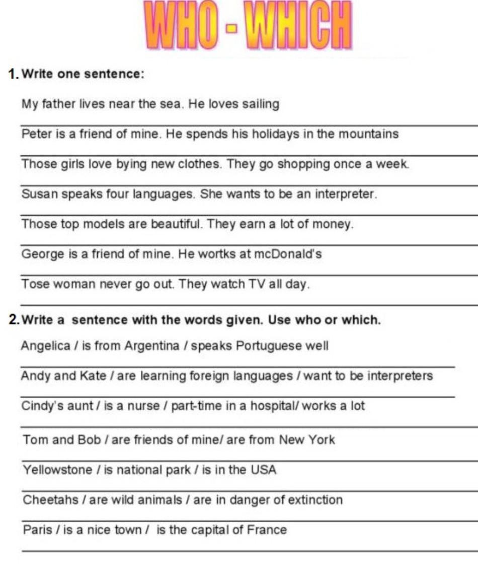 WHO-WHICH 1. Write one sentence: My father lives near the sea. He loves sailing Peter is a friend of mine. He spends his holidays in the mountains Those girls love bying new clothes. They go shopping once a week. Susan speaks four languages. She wants to be an interpreter. Those top models are beautiful. They earn a lot of money. George is a friend of mine. He wortks at mcDonald's Tose woman never go out. They watch TV all day. 2. Write a sentence with the words given. Use who or which. Angelica / is from Argentina / speaks Portuguese well Andy and Kate / are learning foreign languages / want to be interpreters Cindy's aunt / is a nurse / part-time in a hospital/ works a lot Tom and Bob / are friends of mine/ are from New York Yellowstone / is national park / is in the USA Cheetahs / are wild animals / are in danger of extinction Paris / is a nice town / is the capital of France