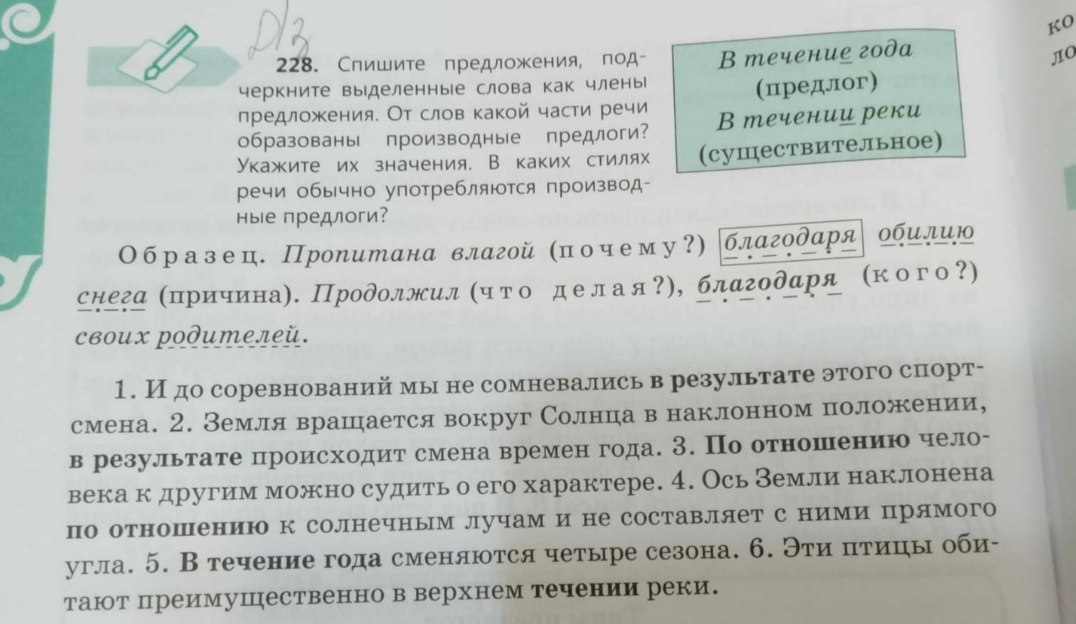 I. Спишите, подчеркните выделенные слова как члены предложения (подчеркнуты в предложениях). Укажите значение производных предлогов (в скобках указано).