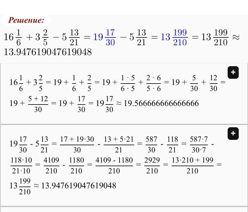 16 1/6+ 3 2/5 - 5 13/21 => НОК(6;5;21) = 210 =>