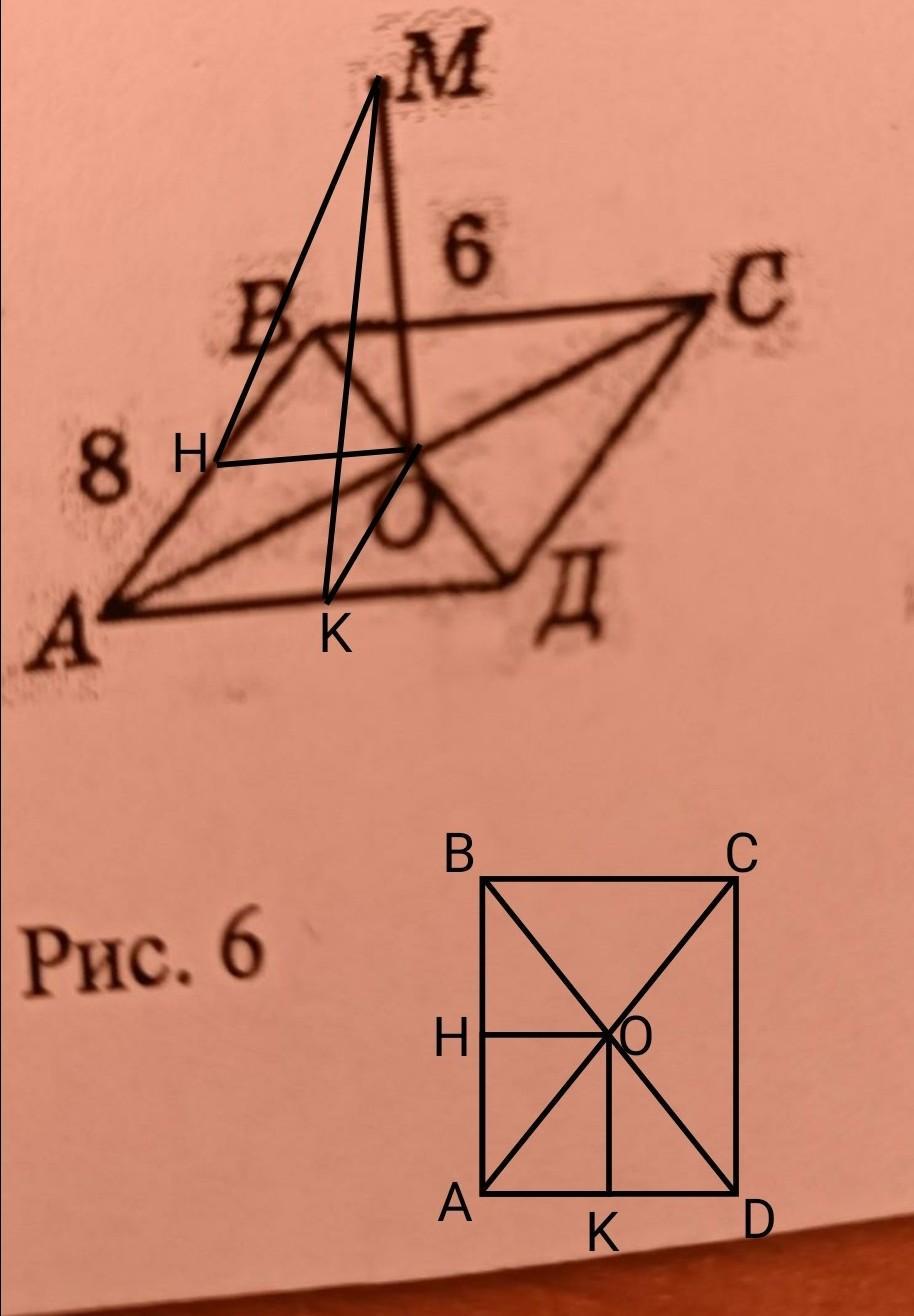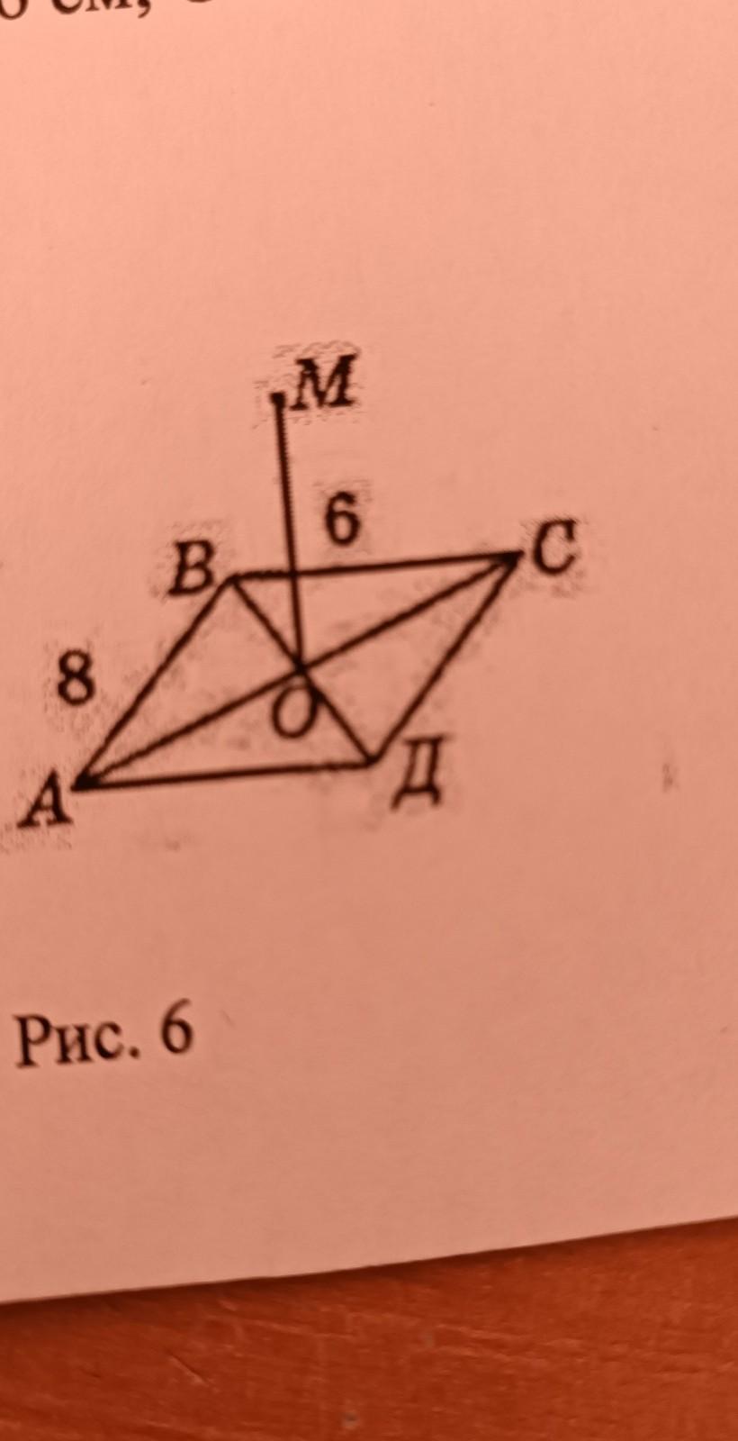 перпендикуляр к плоскости прямоугольника АВСД. Найдите расстояние от точки М до сторон прямоугольника АВСД, если АВ = 8 см, ВС = 6 см, ОМ = 6 см (рис. 6).