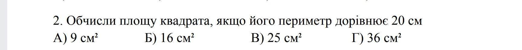 2. Обчисли площу квадрата, якщо його периметр дорівнює 20 см А) 9 см² Б) 16 см² B) 25 см² Г) 36 см²