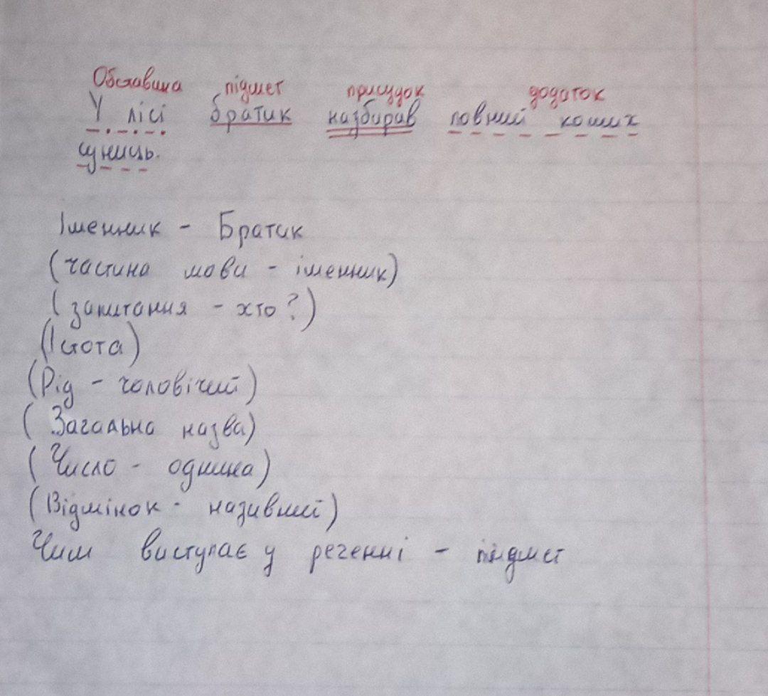 4. Запишіть речення, підкресліть члени речення. Випишіть виділений іменник, виконайте його морфологічний розбір ( частина мови, запитання, істота-неістота, власна назва-загальна, рід, число, відмінок, чим виступає в реченні). 4 бали У лісі братик назбирав повний кошик суниць.