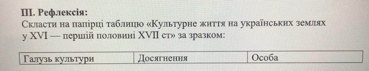Скласти таблицю культурне життя на українських землях у XVI- першій половині XVII за зразком