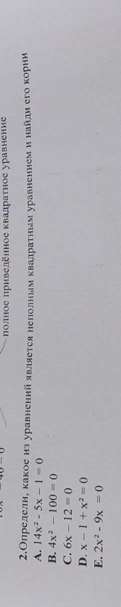 1-3) 2 =V we /12 a 3 2.Определи, какое из уравнений является неполным квадратным уравнением и найди его корни A. 14x² - 5x - 1 = 0 B. 4x² - 100 = 0 С. 6х - 12 = 0 D. x − 1 + x² = 0 E. 2x² - 9x = 0