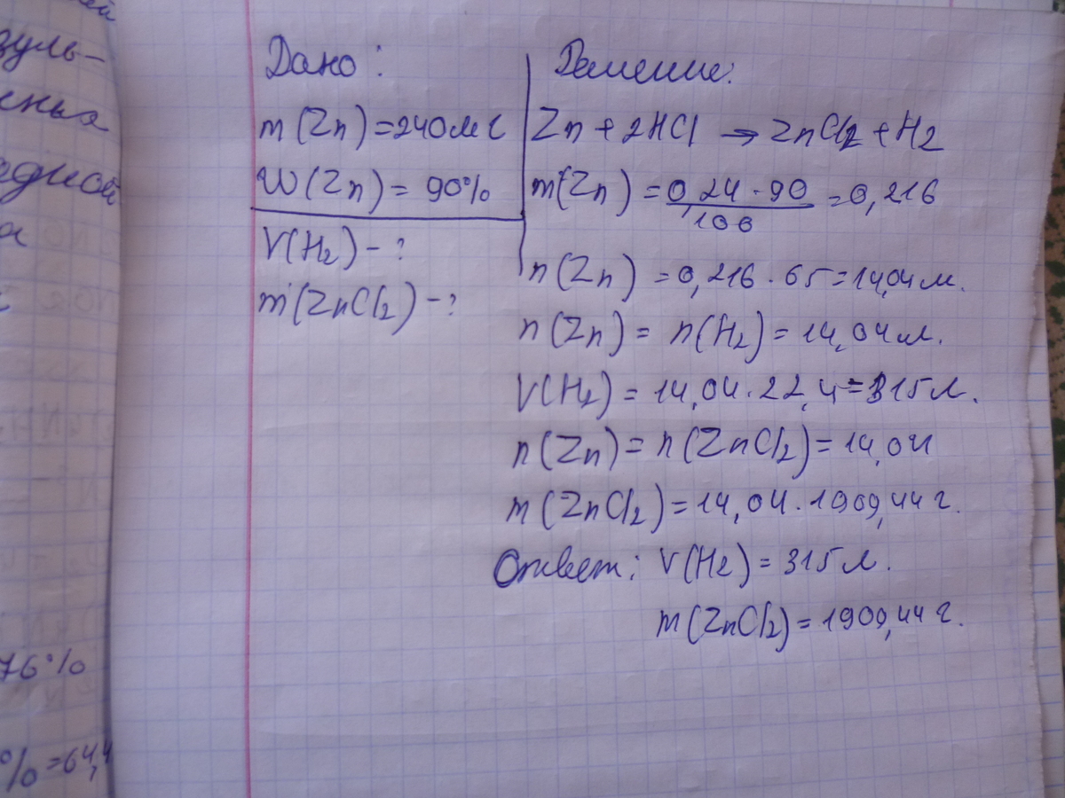 Технический цинк массой 240 мг, содержащий 10% примесей, рамтворили в избытке соляной кислоты. Расчитайте объем выделяющегося водора и массу соли