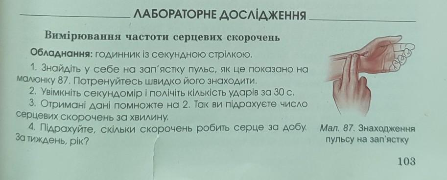 ЛАБОРАТОРНЕ ДОСЛІДЖЕННЯ Вимірювання частоти серцевих скорочень Обладнання: годинник із секундною стрілкою, 1. Знайдіть у себе на зап'ястку пульс, як це показано на малюнку 87. Потренуйтесь швидко його знаходити, 2. Увімкніть секундомір і полічіть кількість ударів за 30 с. 3. Отримані дані помножте на 2. Так ви підрахуете число серцевих скорочень за хвилину, 4. Підрахуйте, скільки скорочень робить серце за добу, Мал. 87. Знаходження За тиждень, рік? пульсу на зап'ястку 103