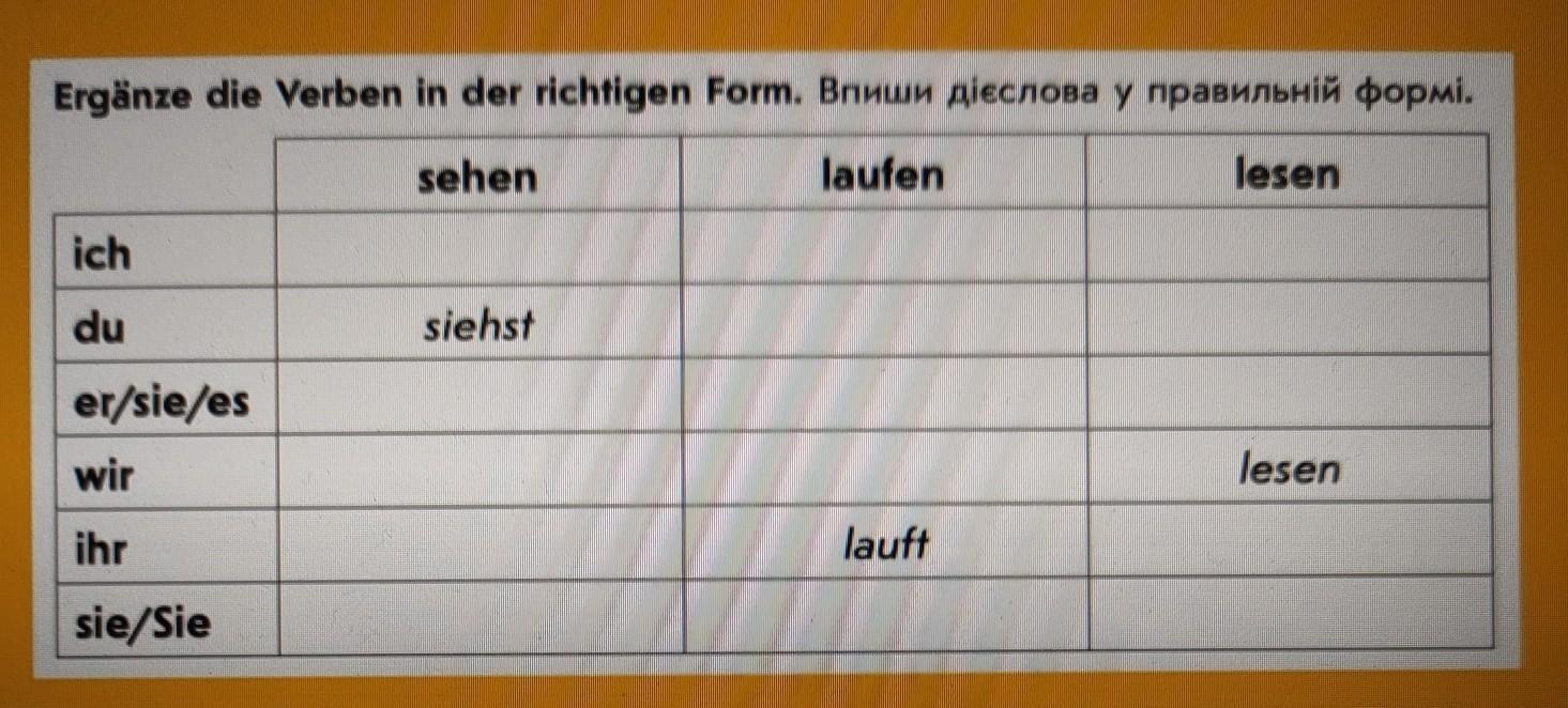 Ich sehe, du siehst, er/sie/es sieht, wir sehen, ihr seht, sie/Sie sehen.