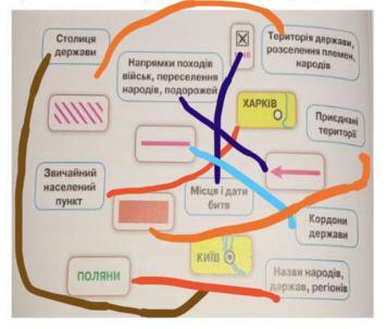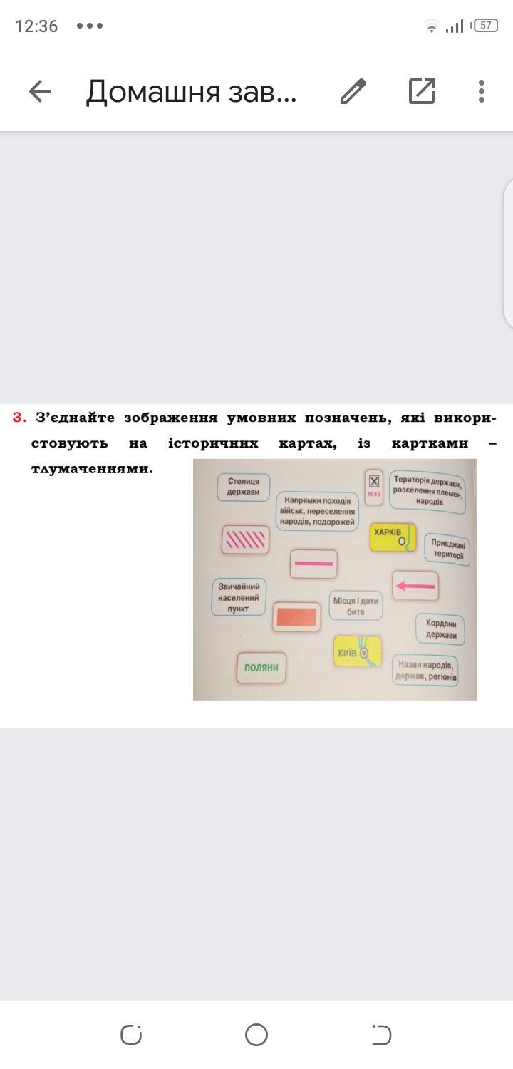 З'єднайте зображення умовних позначень, які викори- стовують на тлумаченнями. історичних картах, картками