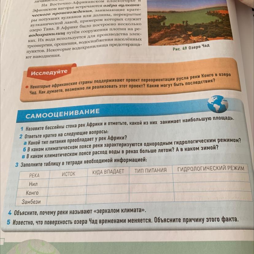 Конго: 1) река Луалаба 2) Атлантический океан 3) в основном, дождевое питание 4) круглый год 5) течет на юго-запад. Нил: 1) река Белый Нил» и река Голубой Нил 2) Средиземное море 3) дождевое питание 4) ежегодное 5) направляется с юго-востока на север Замбези: 1) в болотистой местности в северной Замбии на плато Лунда 2) Индийский океан 3) преимущественно, дождевое питание 4) летний период 5) течет на восток II|