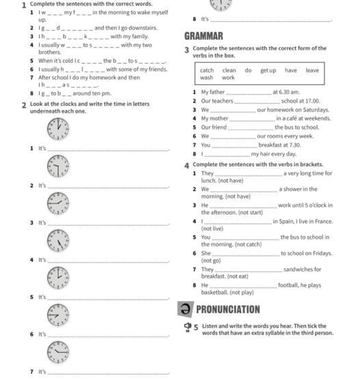 3.1.gets up2.leave3.do4.works5.catches6.clean7.have8.wash