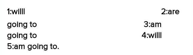 Fill in the gaps with the correct form of will or be going to. Then act out the exchanges. 1 A: What do you want to do when you finish school? B: I'm going.to.... be a dancer. 2 A: I think that house over there is on fire! B: Oh no! I... phone the fire brigade. 3 A: My tea is not sweet enough. B: I... get you some sugar. 4 A: Have you finished your homework yet? B: No, but I ...stay up late and finish it 5 A:.. you have another piece of cake? B: No, thank you. I've already had two pieces. 6 A: Do you want to go to the park this afternoon? B: I can't... I visit my grandparents. 7 A: This box is very heavy! B:I... carry it for you. 8 A:... you open the window, please? B: No, it's too cold in here.