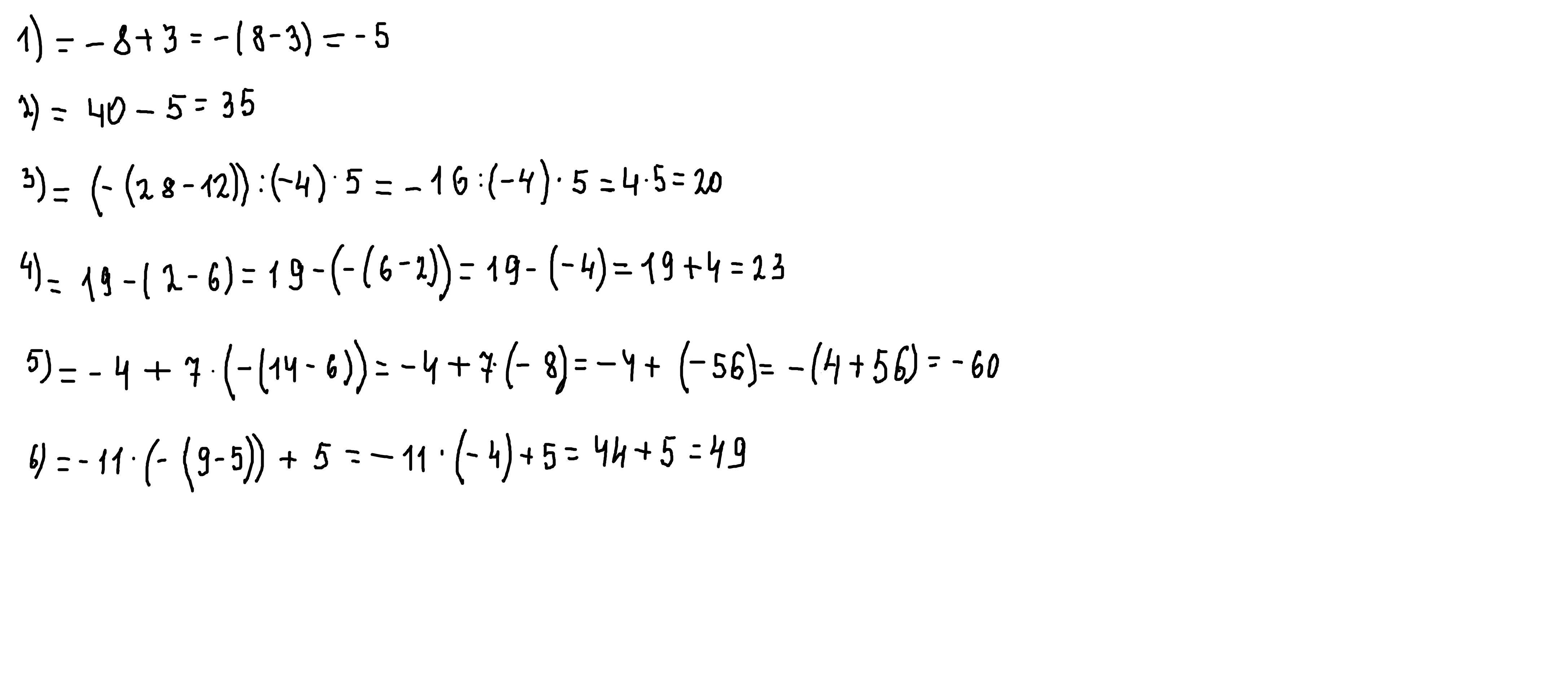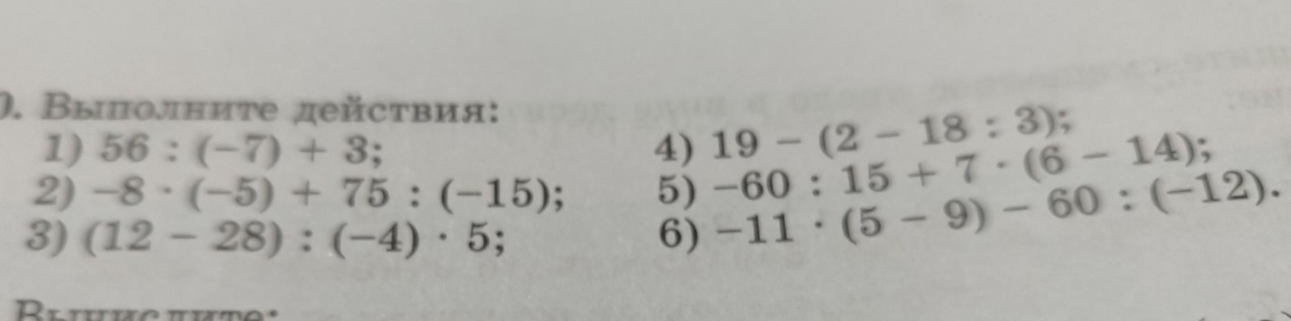520. Выполните действия: 1) 56 (-7) + 3; 2) -8 (-5) + 75: (-15); 3) (1228) : (-4) 5; . . 4) 19 (2- 18:3); 5) -60: 15 +7 (6-14); 6)-11 (59) - 60 (-12). можно с пошаговым обесценением