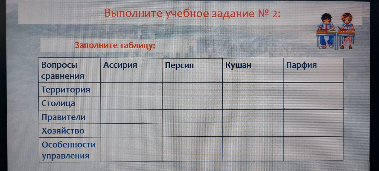 Столица : Ассирия - Ашшур , Персия - персополь , Кушан - пурушапура , Парфия - гекатомпил