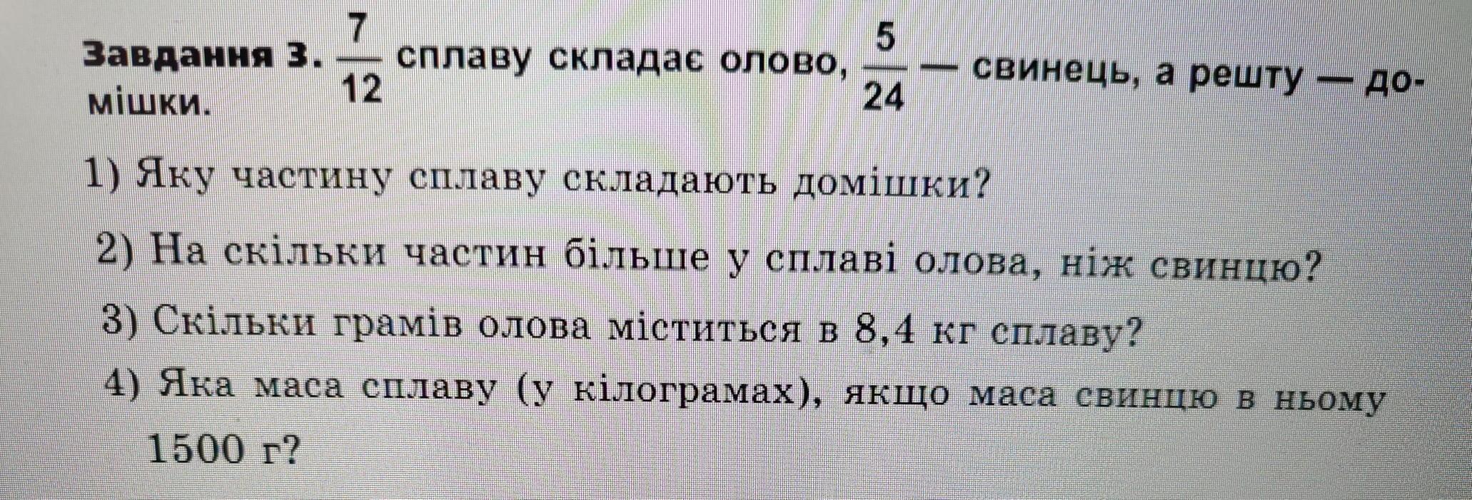 СРОЧНО ПОМОГИТЕ 3. сплаву складає олово, мішки. 12 5 24 свинець, а решту до- 1) Яку частину сплаву складають домішки? 2) На скільки частин більше у сплаві олова, ніж свинцю? 3) Скільки грамів олова міститься в 8,4 кг сплаву? 4) Яка маса сплаву (у кілограмах), якщо маса свинцю в ньому 1500 r?