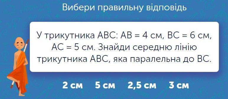 Перевод: В треугольнике АВС: AB = 4 см, BC = 6 см, AC = 5 см. Найди среднюю линию треугольника, параллельную ВС.