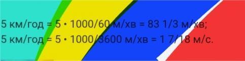 пішохід іде зі швидкістю 5 км/год. Виразіть його швидкість у метрах за хвилину та в метрах за секунду