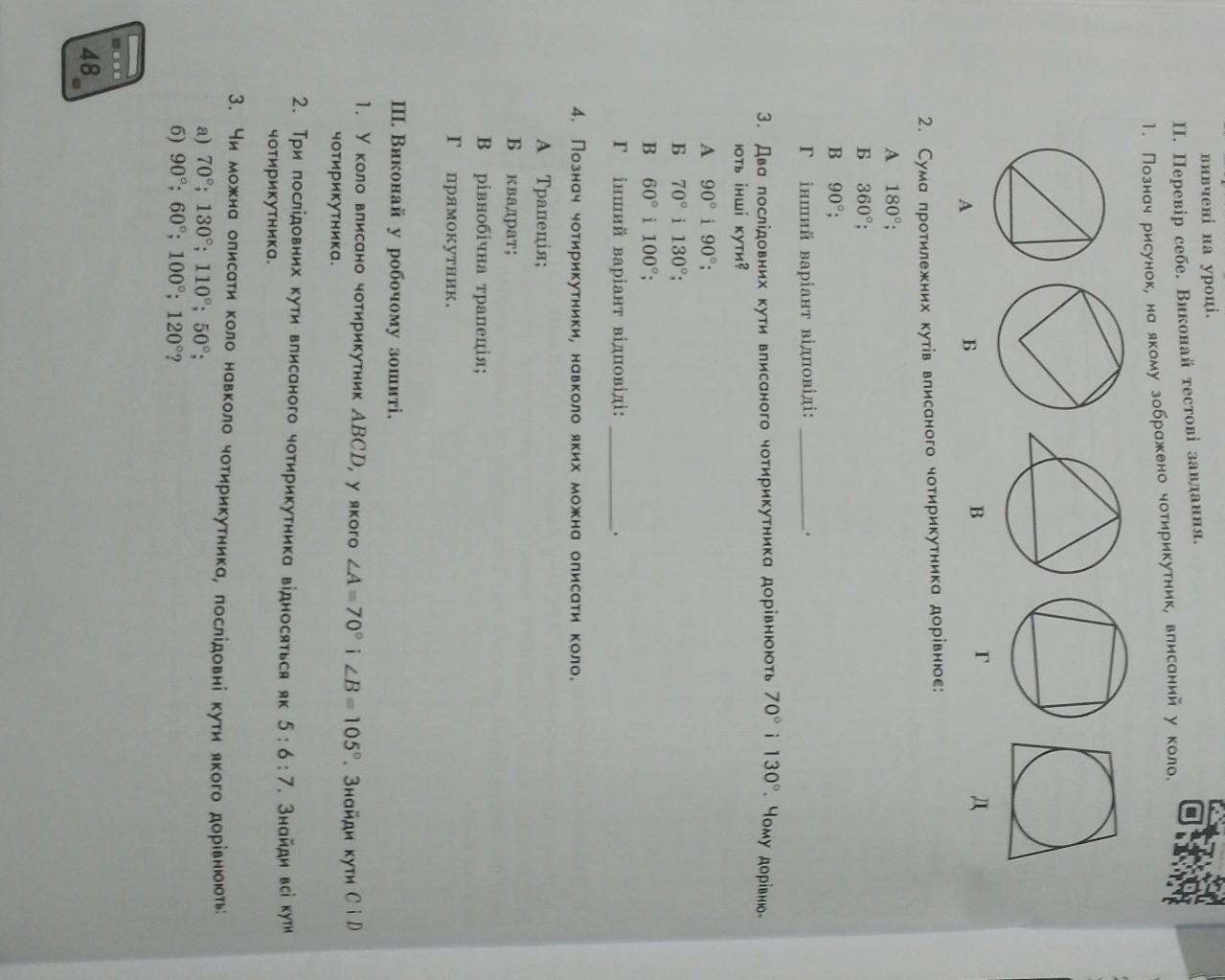 так как суммы противоположных углов равны 180° ,то можно описать окружность около четырехугольника