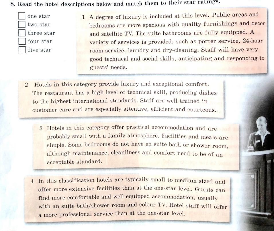 "Hotels in this category provide luxury and exceptional comfort. Bedrooms are more spacious with quality furnishings and decor. A variety of services is provided, such as porter service, 24-hour room service, laundry, and dry-cleaning. Staff will have very good technical and social skills, anticipating and responding to guests' needs."